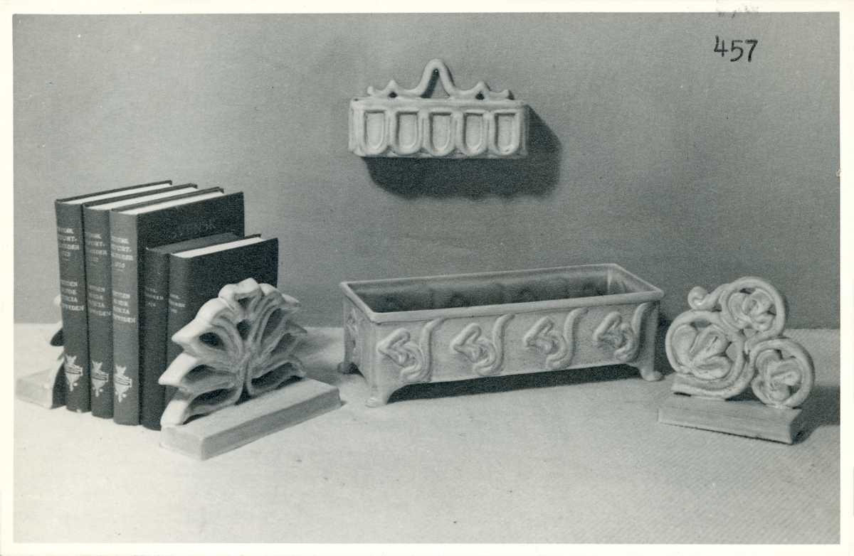 Bokstöd, blomlåda och väggvas från Bo Fajans, formgivare Eva Jancke-Björk, 1900-talets mitt. Frost glasyr.