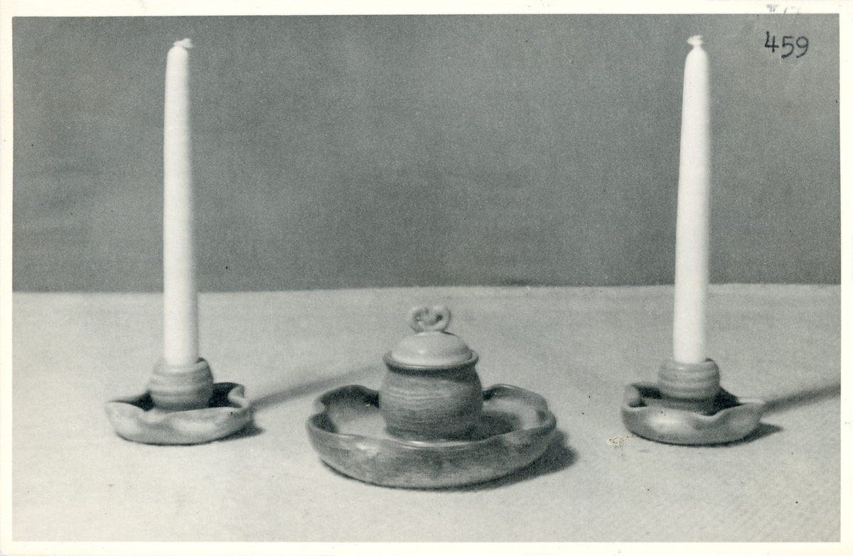 Ljusstakar och bläckhorn från Bo Fajans, formgivare Eva Jancke-Björk, 1900-talets mitt. Frost glasyr.