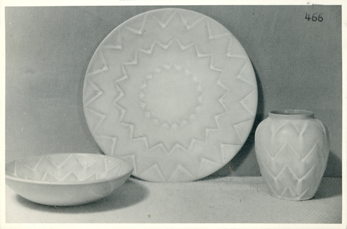 Skål, fat och vas från Bo Fajans, formgivare Eva Jancke-Björk, 1900-talets mitt.