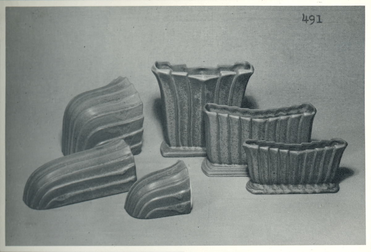 Väggvaser, vaser samt en blomskål från Bo Fajans, formgivare Ewald Dahlskog, 1900-talets mitt. Glasyrerna topas, turkos samt smaragd.