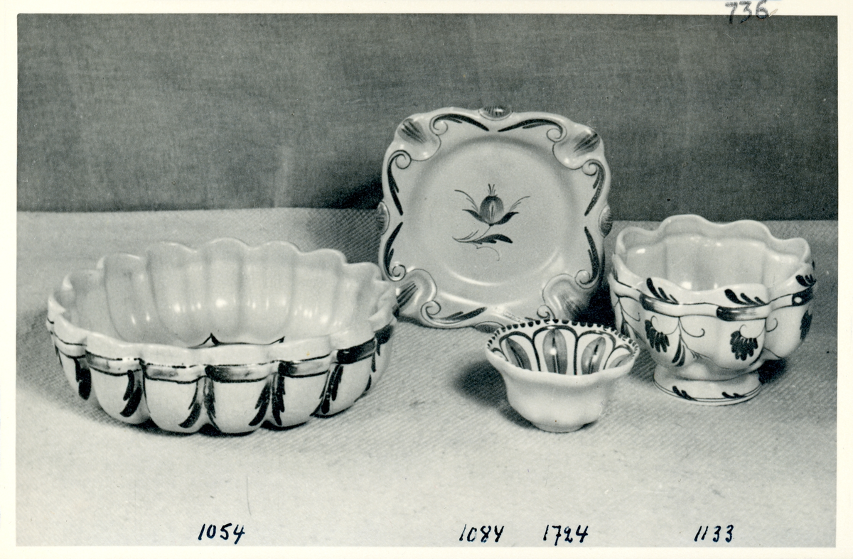 Skålar och assiett från Bo Fajans, formgivna av Allan Ebeling, tidigt 1900-tal.