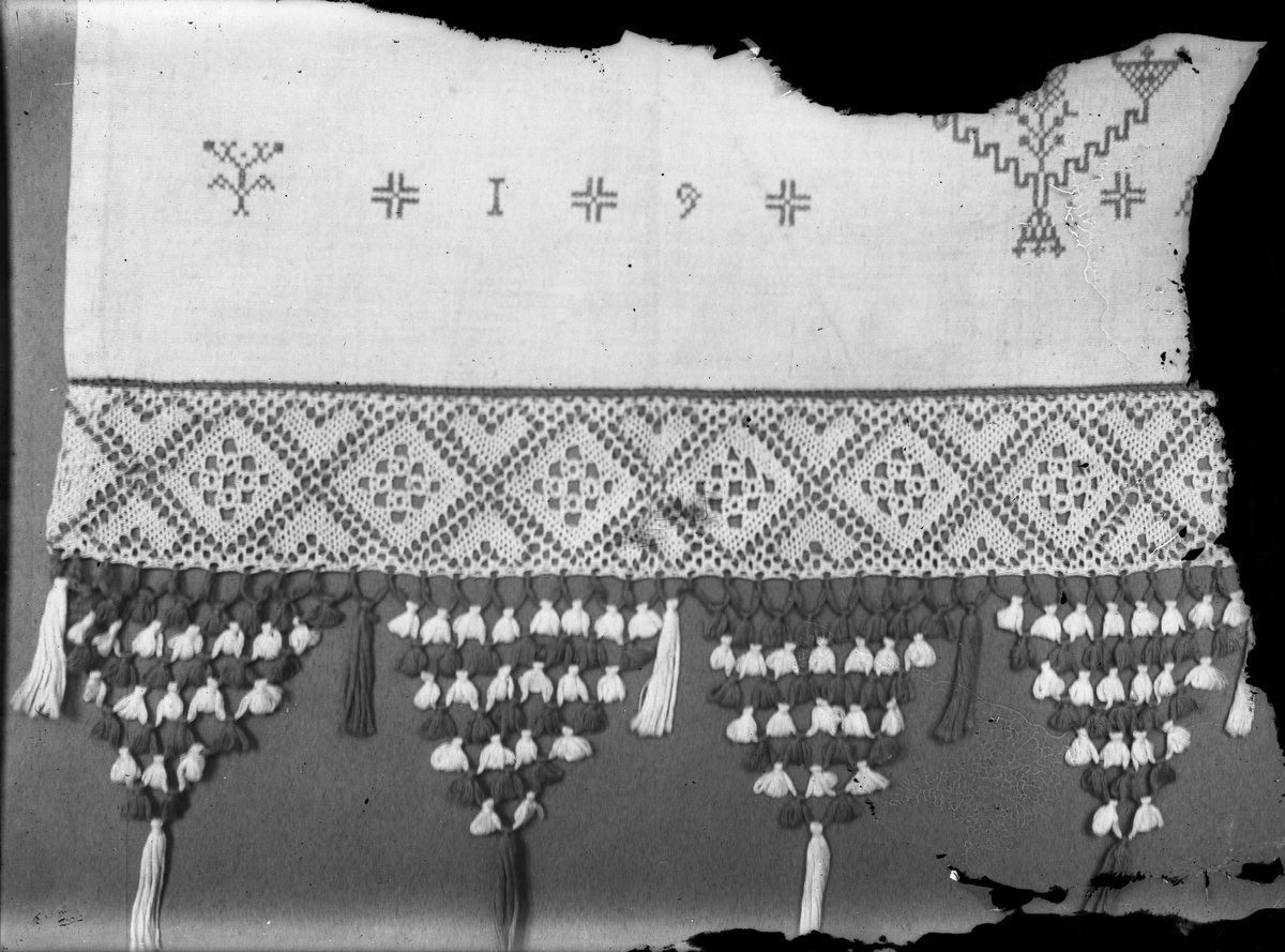Bård av knypplad spets och kläppfrans, broderier i korssöm.