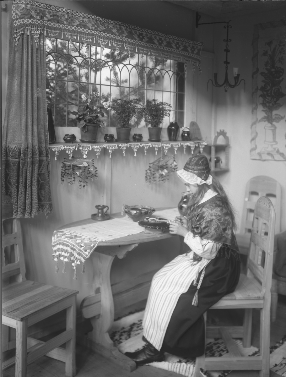 Utställning av hemslöjd. Flicka klädd i folkdräkt sitter och knypplar i utställningsinteriör.