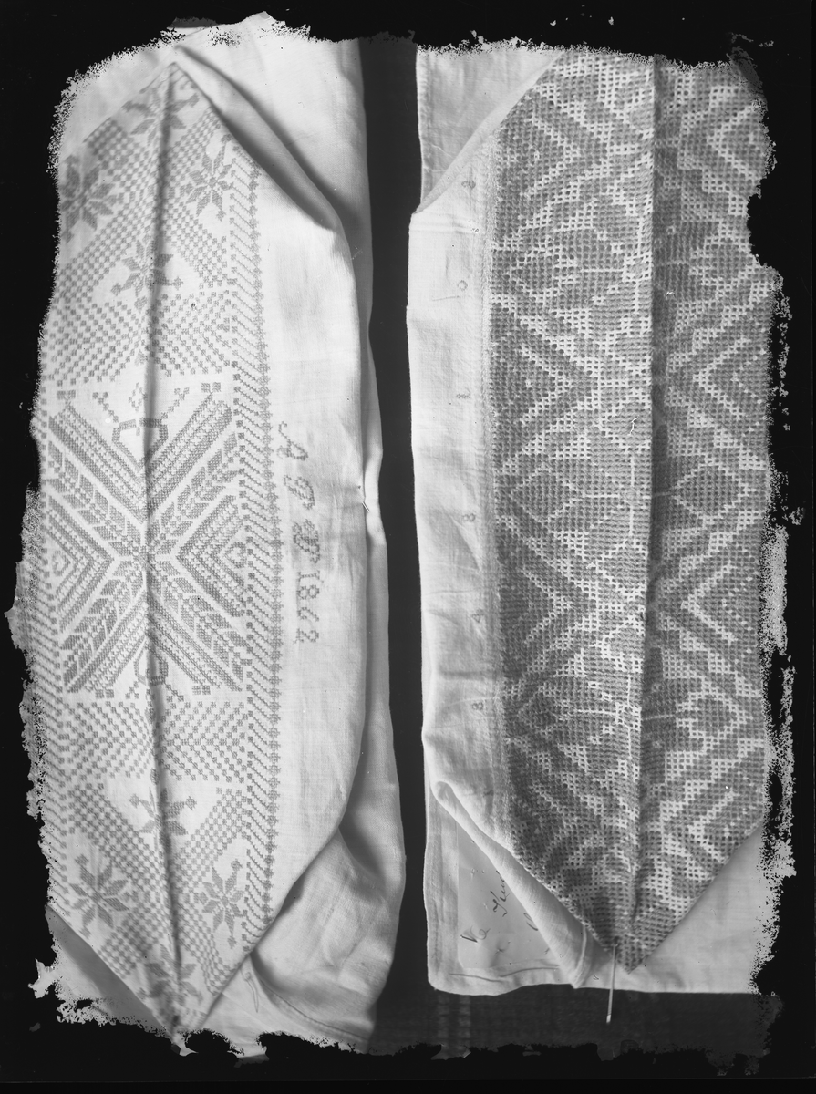 Två broderade örngottshuvor i korssöm, märkt "APD 1862", resp. dubbel utdragssöm (näversöm), märkt "1848 IOS".