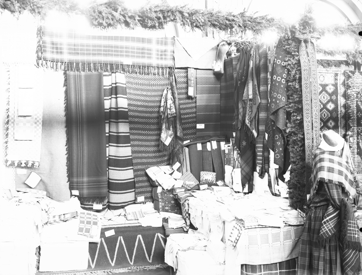 Hemslöjdsutställning "Torsåker och Hofors", textilier, vävnader i olika tekniker, opphämta, munkabälte, rya, rips, rosengång mm. I förgrunden en klänning och halskläden.