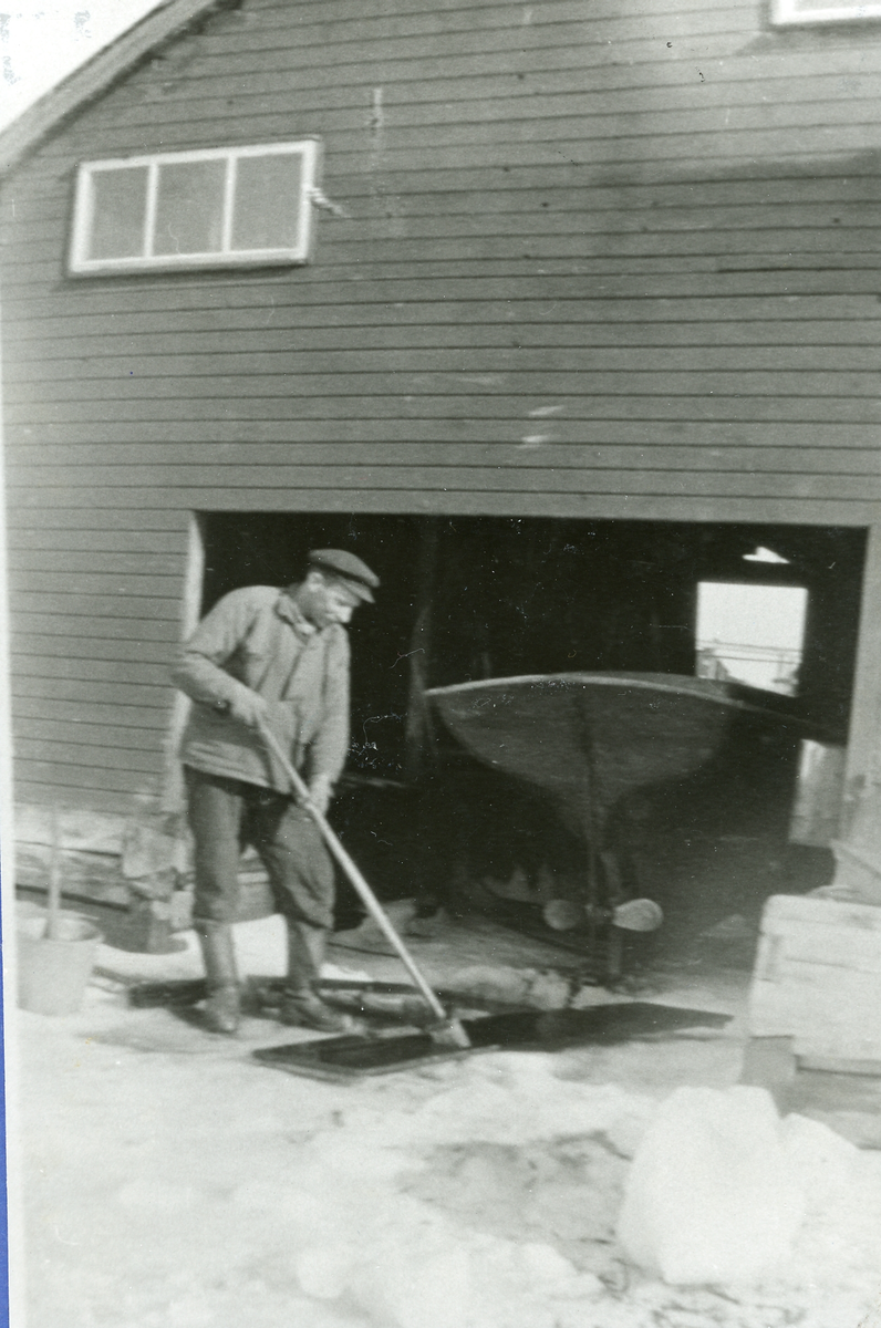 Emil Söderhäll vaskar flakar på isen framför ett båthus, 1950-tal.
