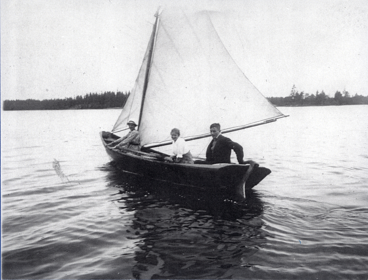 Tre personer ute och seglar med storekan "Tärnan", P-O Berglund, silvermedalj vid Gefleutställningen.