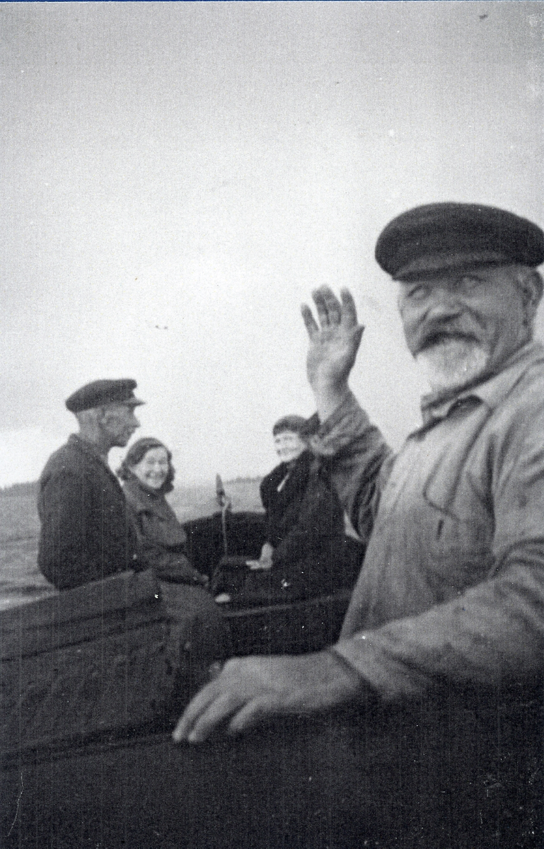 Hej, hej vi ses igen, vinkar Wilhelm Grönqvist! Fyra personer i båt på väg ut på sjön.