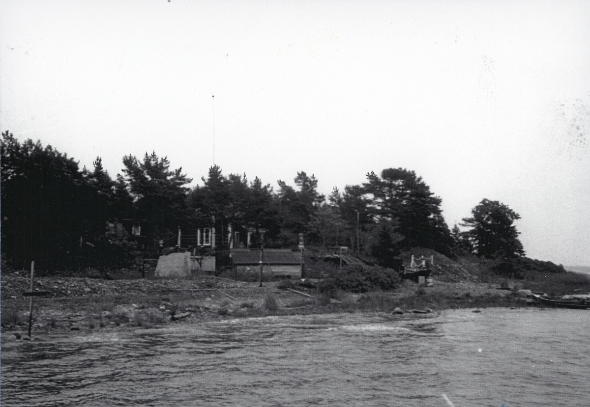 Strandkant på Limön utan vass och havtorn med stuga och träd längs med stranden, 1946.