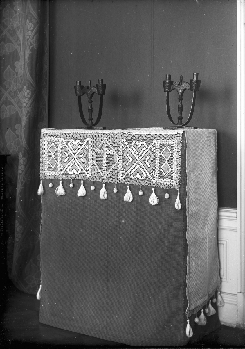 Altararrangemang med altarbrun i pinnspets (knutet och trätt), altarduk och ljusstakar.