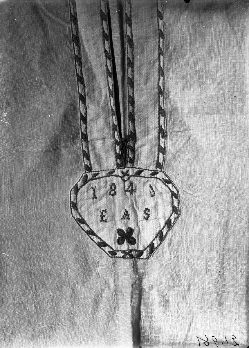 Detalj av mansskjorta med broderi i plattsöm och efterstygn, märkning i korssöm "1846 EAS", förstärkning i sprundet.