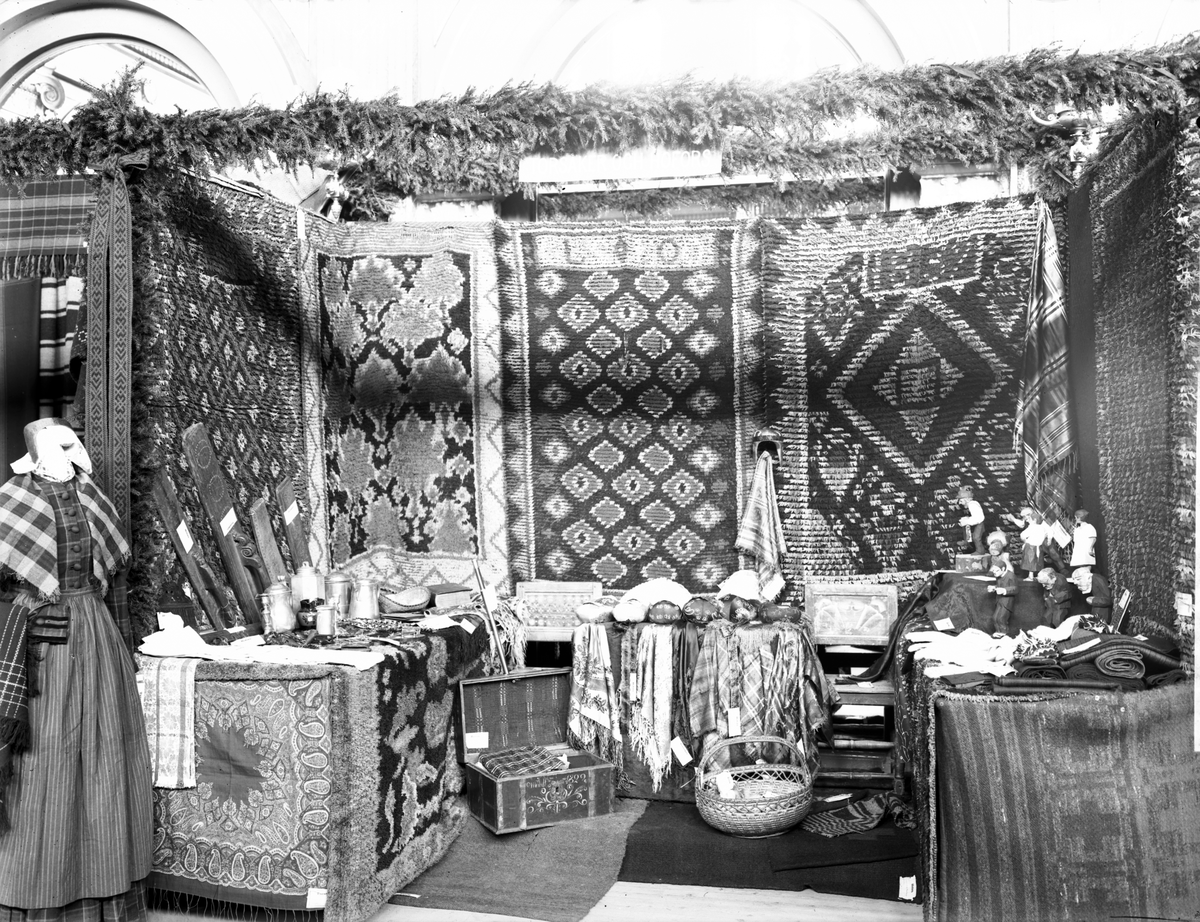 Hemslöjdsutställning "Torsåker och Hofors", textilier, ryor varav en märkt "1839", bindmössor och halskläden, snidade träfigurer, allmogekista märkt "1829", mangeldon och stolar. Arrangemang av klänning, förkläde, bindmössa och halskläden.
