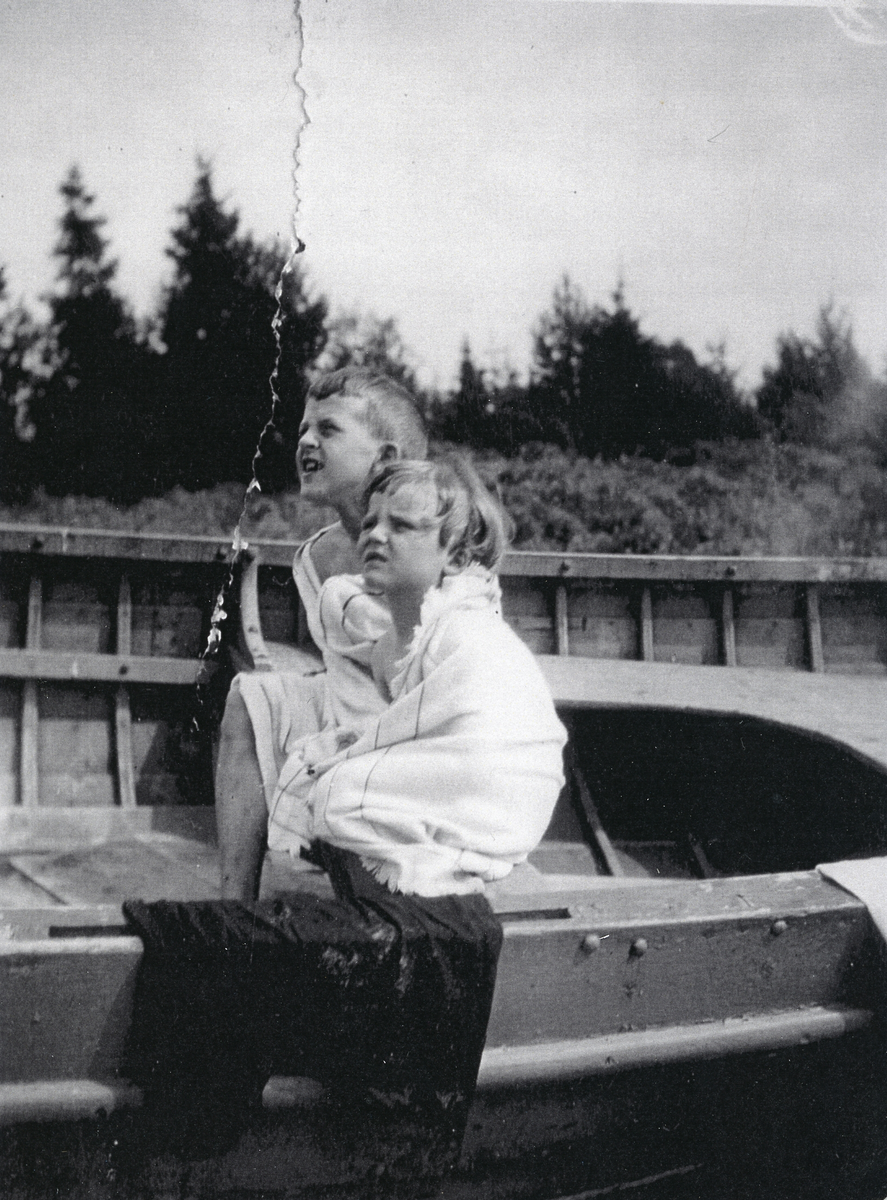 Olle och Sven, invirade i badlakan, i gisten livbåt på stranden i Scoutviken, ca 1927.