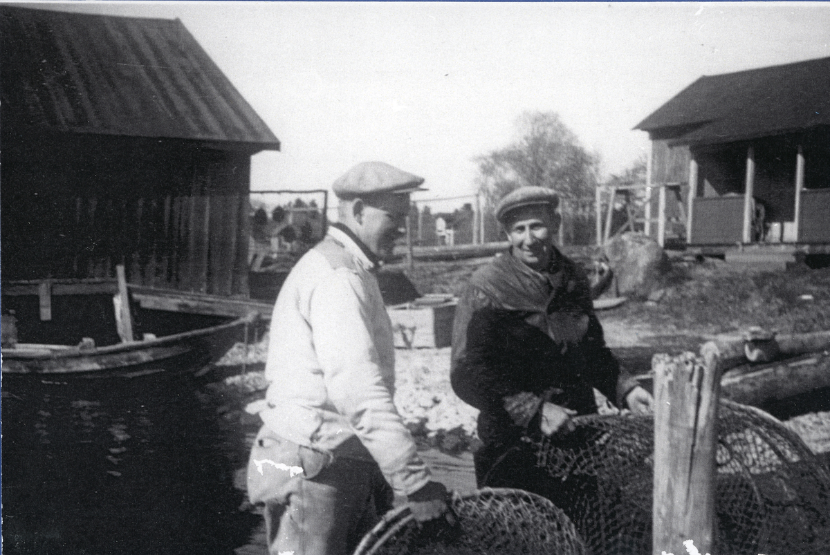 Titel: Fiskarsönerna Arne Sjölin och Helge Söderhäll med en ryssja vid strandkant med sjöbod och stuga i bakgrunden, 1950-tal.