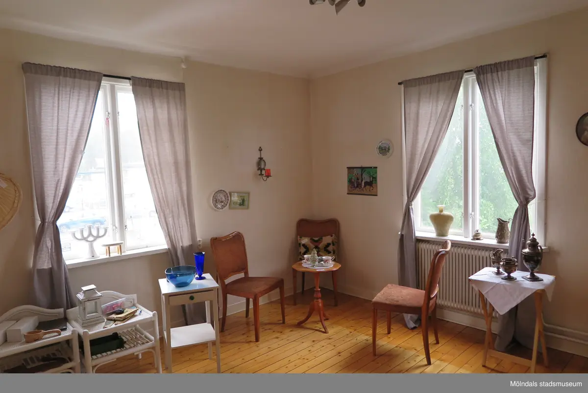 Höger del av ett möblerat vardagsrum med två gardinförsedda fönster samt trägolv, Krokslättsgatan 18 i Mölndal 2023-06-21. I rummet finns utplacerade föremål som är till försäljning. Fotodokumentation av ett friliggande bostadshus/villa byggt 1932 med fyra (4) våningsplan. Byggnaden har tvättstuga i källaren samt torkvind på övervåningen. Boarea: 140 kvm, totalarea: 1004 kvm. Villan är ombyggd och fördelad på fyra (4) hyreslägenheter.