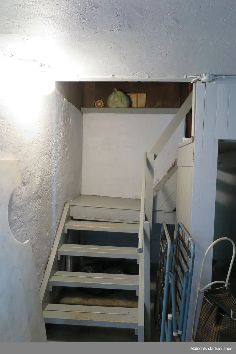 En gråmålad låg trappa (fem steg) med trappräcke som leder upp ifrån ett vitmålat källarutrymme (se 2024_1514), Krokslättsgatan 18 i Mölndal 2023-06-21. Till höger ses en ifällbar säng samt en dramatenvagn/shoppingvagn. Fotodokumentation av ett friliggande bostadshus/villa byggt 1932 med fyra (4) våningsplan. Byggnaden har tvättstuga i källaren samt torkvind på övervåningen. Boarea: 140 kvm, totalarea: 1004 kvm. Villan är ombyggd och fördelad på fyra (4) hyreslägenheter.