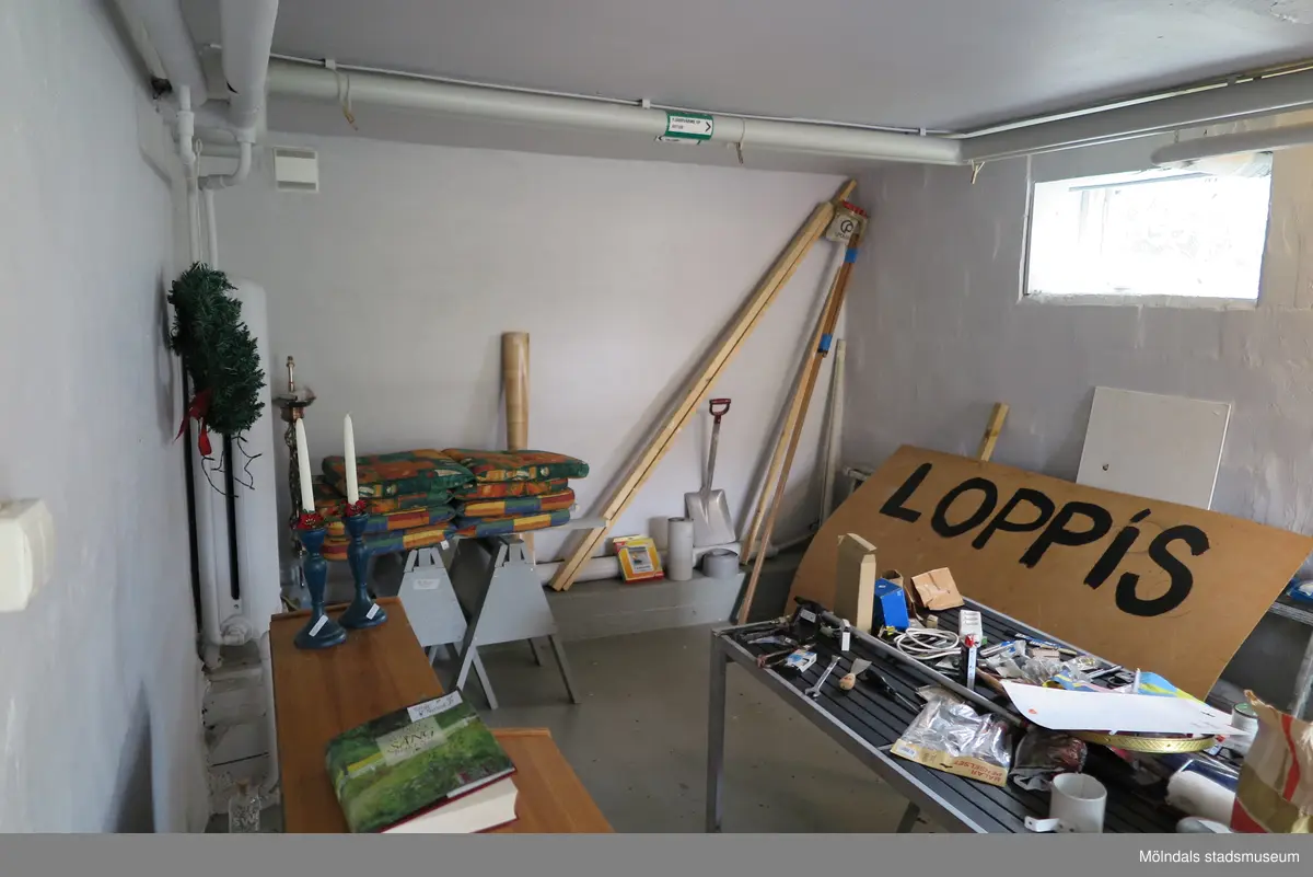 Ett vitmålat källarutrymme fullt med diverse saker samt en Loppis-skylt som ligger på golvet, Krokslättsgatan 18 i Mölndal 2023-06-21. I taket ses tjocka rör och till höger ett avlångt litet fönster. Fotodokumentation av ett friliggande bostadshus/villa byggt 1932 med fyra (4) våningsplan. Byggnaden har tvättstuga i källaren samt torkvind på övervåningen. Boarea: 140 kvm, totalarea: 1004 kvm. Villan är ombyggd och fördelad på fyra (4) hyreslägenheter.