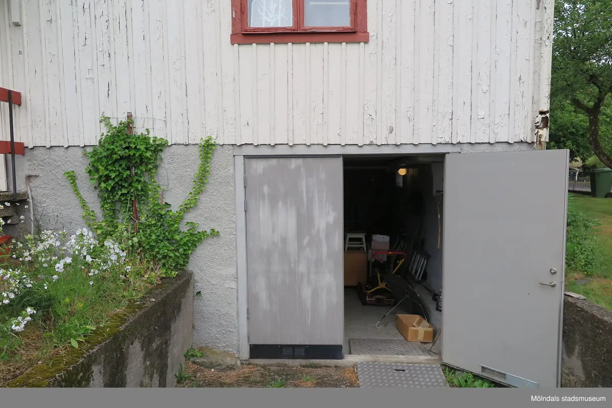 Ingång från trädgården till förråd/garage i källarplan (se 2024_1530), Krokslättsgatan 18 i Mölndal 2023-06-21. Till vänster ses växlighet. Rakt fram ses en del av den vita husfasaden samt en (av två) öppen dörr till förrådet. Fotodokumentation av ett friliggande bostadshus/villa byggt 1932 med fyra (4) våningsplan. Byggnaden har tvättstuga i källaren samt torkvind på övervåningen. Boarea: 140 kvm, totalarea: 1004 kvm. Villan är ombyggd och fördelad på fyra (4) hyreslägenheter.