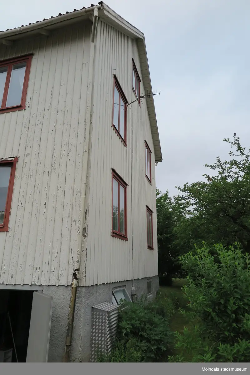 Höger kortsida av bostadshus med vit träfasad och där lägenheternas fönsterkarmar är målade i roströd kulör (se 2024_1532), Krokslättsgatan 18 i Mölndal 2023-06-21. Till vänster skymtar dess förråd/garage i källarplan. Fotodokumentation av ett friliggande bostadshus/villa byggt 1932 med fyra (4) våningsplan. Byggnaden har tvättstuga i källaren samt torkvind på övervåningen. Boarea: 140 kvm, totalarea: 1004 kvm. Villan är ombyggd och fördelad på fyra (4) hyreslägenheter.