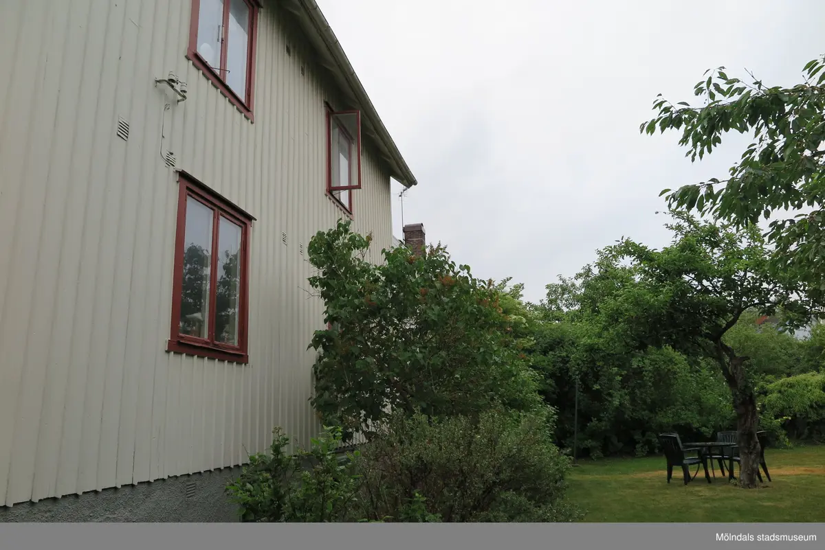 Bostadshusets baksida med dess vita träfasad och tre fönster med roströda karmar (se 2024_1535), Krokslättsgatan 18 i Mölndal 2023-06-21. Till höger ses växtlighet och trädgårdsmöbler i trädgården. Fotodokumentation av ett friliggande bostadshus/villa byggt 1932 med fyra (4) våningsplan. Byggnaden har tvättstuga i källaren samt torkvind på övervåningen. Boarea: 140 kvm, totalarea: 1004 kvm. Villan är ombyggd och fördelad på fyra (4) hyreslägenheter.