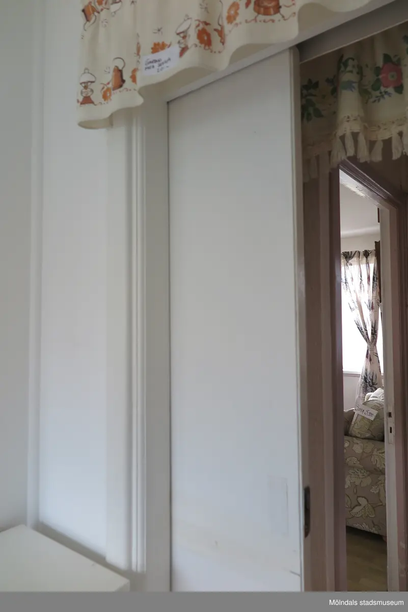 En skjutdörr mellan ett kök och en hall, Krokslättsgatan 18 i Mölndal 2023-06-21. Ovanför var sida om skjutdörren hänger en mönstrad gardin-kappa. I bakgrunden ses del av ett möblerat vardagsrum. Fotodokumentation av ett friliggande bostadshus/villa byggt 1932 med fyra (4) våningsplan. Byggnaden har tvättstuga i källaren samt torkvind på övervåningen. Boarea: 140 kvm, totalarea: 1004 kvm. Villan är ombyggd och fördelad på fyra (4) hyreslägenheter.