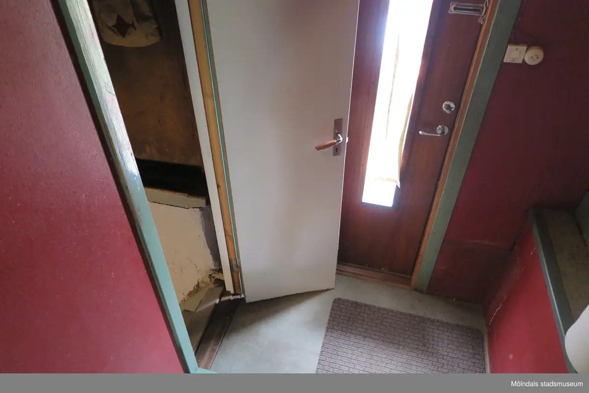 Vy från en trappavsats, av en liten hall med rostrött målade sidoväggar och mellangröna dörrlister samt en stängd ytterdörr, Krokslättsgatan 18 i Mölndal 2023-06-21. Till vänster ses en öppen vitmålad innerdörr, med en trappa som leder ner till källaren. Fotodokumentation av ett friliggande bostadshus/villa byggt 1932 med fyra (4) våningsplan. Byggnaden har tvättstuga i källaren samt torkvind på övervåningen. Boarea: 140 kvm, totalarea: 1004 kvm. Villan är ombyggd och fördelad på fyra (4) hyreslägenheter.