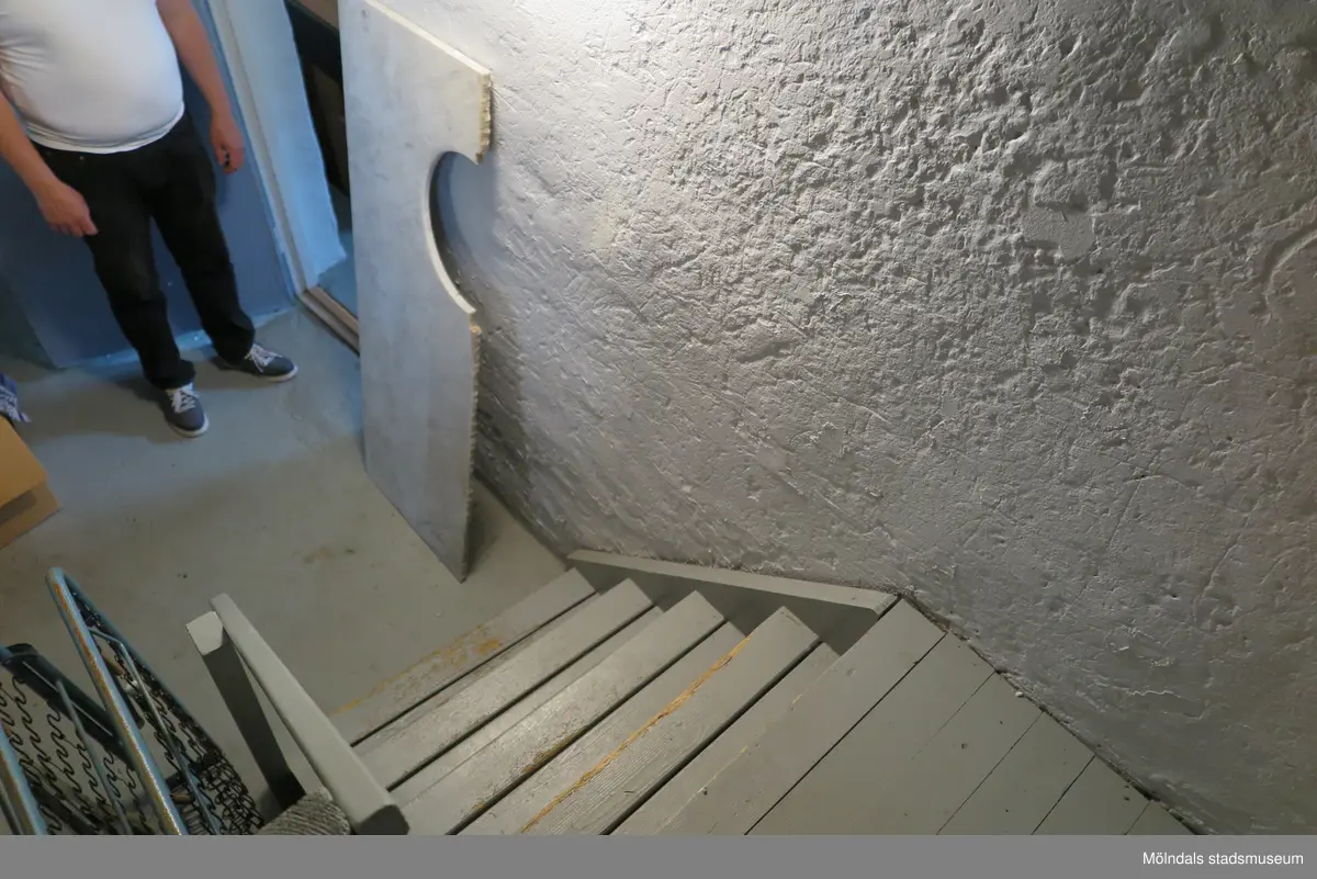En gråmålad låg trappa (fem steg) med trappräcke som leder ner till ett källarutrymme (se 2024_1512), Krokslättsgatan 18 i Mölndal 2023-06-21. Till vänster ses en ifällbar säng, rakt fram skymtar en okänd man som står vid en dörröppning och till höger en vitmålad cementvägg. Fotodokumentation av ett friliggande bostadshus/villa byggt 1932 med fyra (4) våningsplan. Byggnaden har tvättstuga i källaren samt torkvind på övervåningen. Boarea: 140 kvm, totalarea: 1004 kvm. Villan är ombyggd och fördelad på fyra (4) hyreslägenheter.