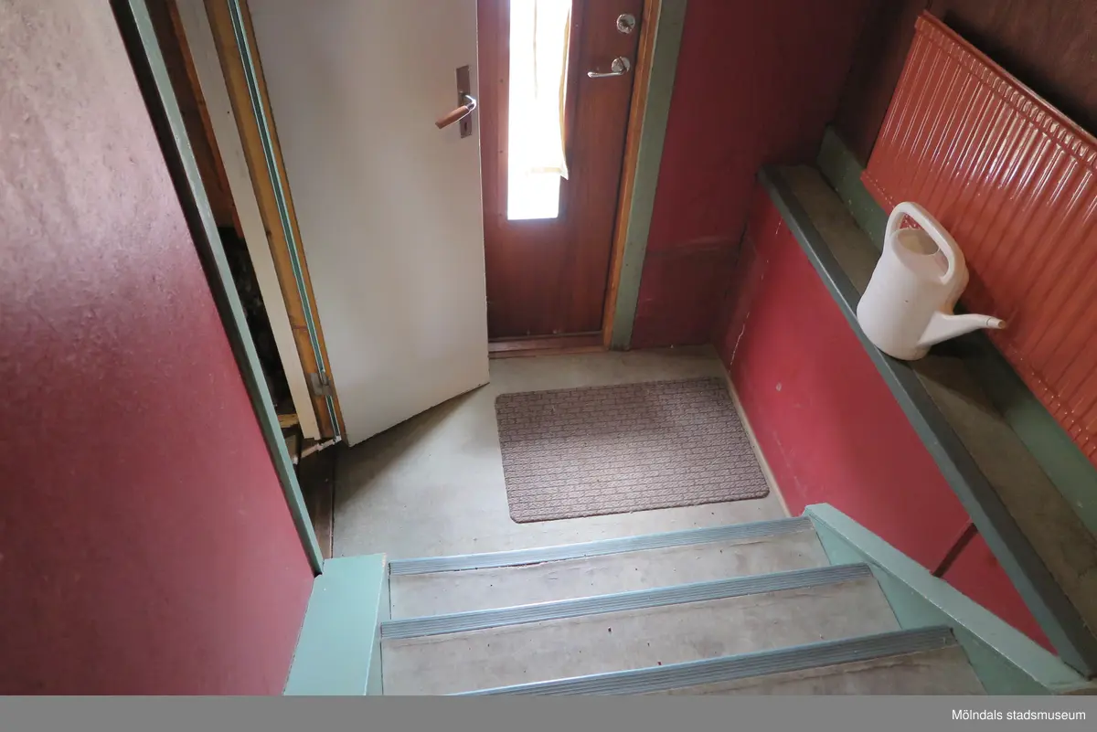 Vy lite högre upp från en trappavsats, av en liten hall med rostrött målade sidoväggar och mellangröna dörrlister samt en stängd ytterdörr (se 2024_1512), Krokslättsgatan 18 i Mölndal 2023-06-21. Till vänster ses en öppen vitmålad innerdörr. Till höger ses en låg hylla där det står en vattenkanna och ett element. Fotodokumentation av ett friliggande bostadshus/villa byggt 1932 med fyra (4) våningsplan. Byggnaden har tvättstuga i källaren samt torkvind på övervåningen. Boarea: 140 kvm, totalarea: 1004 kvm. Villan är ombyggd och fördelad på fyra (4) hyreslägenheter.