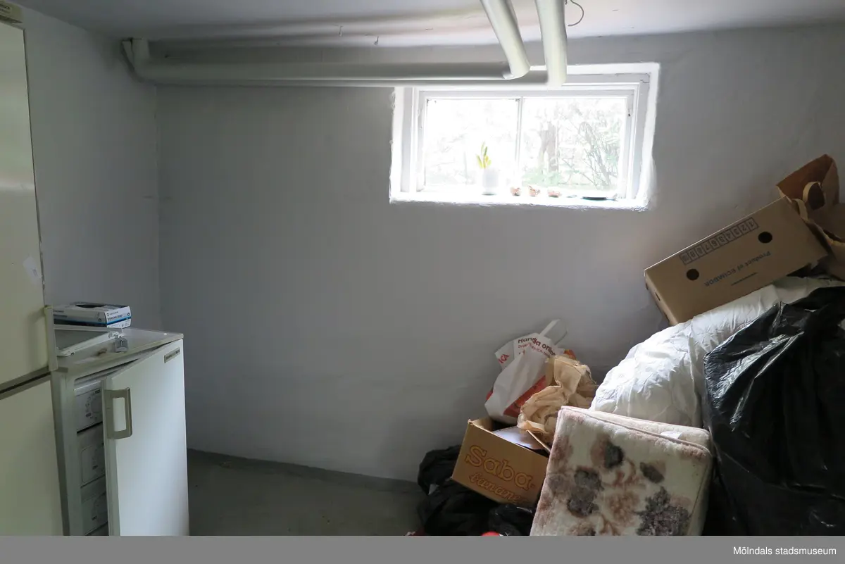 Till vänster i källarutrymmet ses vitvaror (kyl/frys) samt en låg frys med öppen skåpsdörr, Krokslättsgatan 18 i Mölndal 2023-06-21. Till höger ligger kartonger samt diverse saker direkt på golvet. I rummet finns ett avlångt litet fönster och i taket sitter tjocka vattenrör. Fotodokumentation av ett friliggande bostadshus/villa byggt 1932 med fyra (4) våningsplan. Byggnaden har tvättstuga i källaren samt torkvind på övervåningen. Boarea: 140 kvm, totalarea: 1004 kvm. Villan är ombyggd och fördelad på fyra (4) hyreslägenheter.