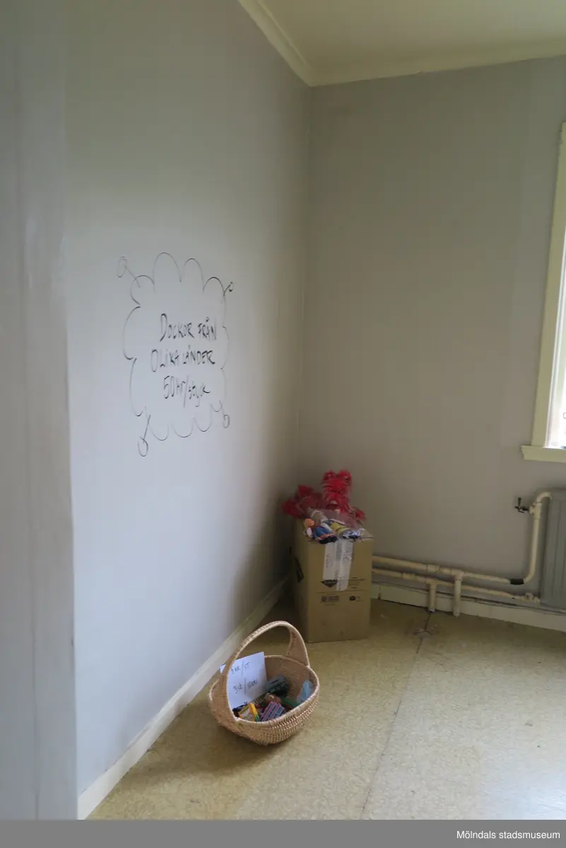 Man ser vänster hörna av ett gråmålat rum, Krokslättsgatan 18 i Mölndal 2023-06-21. I hörnet står en kartong fylld med saker samt en korg med föremål som är till salu. På väggen är textat med svart tusch "Dockor från olika länder 50:-/styck". Texten är inritad i ett moln. Fotodokumentation av ett friliggande bostadshus/villa byggt 1932 med fyra (4) våningsplan. Byggnaden har tvättstuga i källaren samt torkvind på övervåningen. Boarea: 140 kvm, totalarea: 1004 kvm. Villan är ombyggd och fördelad på fyra (4) hyreslägenheter.