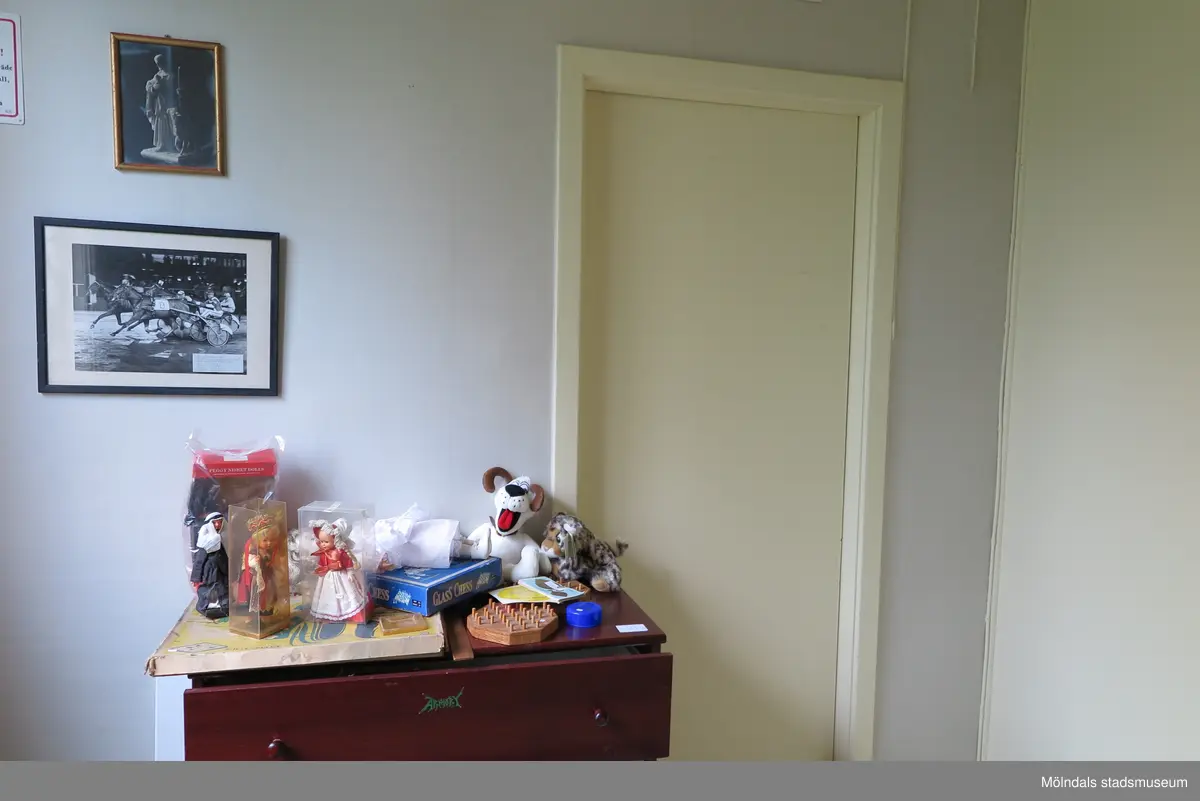 En innervägg i ett gråmålat rum (samma rum som 2024_1466), Krokslättsgatan 18 i Mölndal 2023-06-21. Till vänster hänger två tavlor. Rakt fram ses en byrå med två delvis utdragna lådor samt leksaker ovanpå. Till höger om byrån finns en innedörr. Fotodokumentation av ett friliggande bostadshus/villa byggt 1932 med fyra (4) våningsplan. Byggnaden har tvättstuga i källaren samt torkvind på övervåningen. Boarea: 140 kvm, totalarea: 1004 kvm. Villan är ombyggd och fördelad på fyra (4) hyreslägenheter.