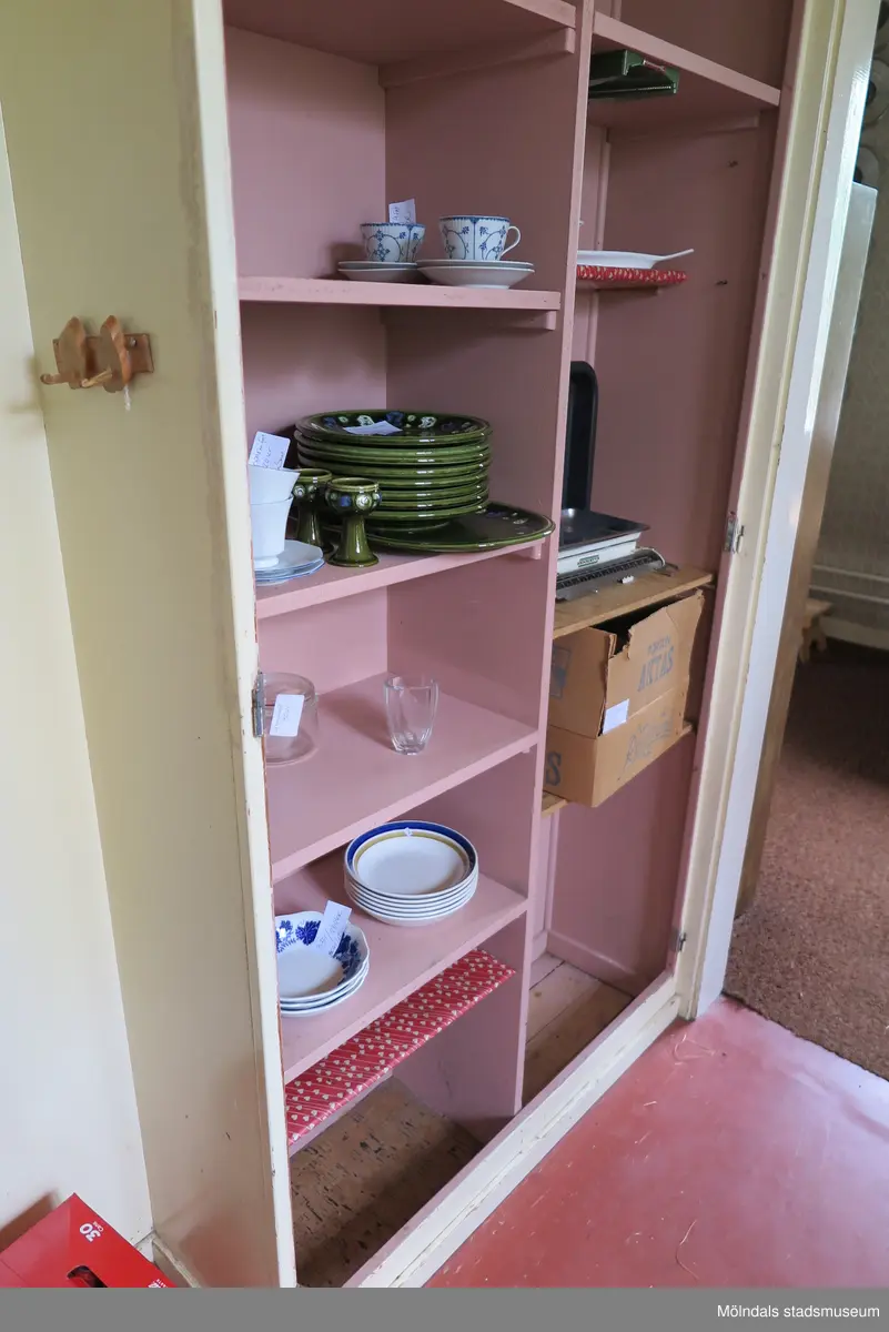Del av kök med ett fullhögt väggskåp (se 2024_1473), Krokslättsgatan 18 i Mölndal 2023-06-21. Skåpets utsida är målat i beige kulör och insida i rosa kulör. Luckor saknas. Skåpet är fyllt av porslin och diverse köksföremål. På dess utsida sitter två träkrokar. Till höger ses en dörr som leder till ett rum. Fotodokumentation av ett friliggande bostadshus/villa byggt 1932 med fyra (4) våningsplan. Byggnaden har tvättstuga i källaren samt torkvind på övervåningen. Boarea: 140 kvm, totalarea: 1004 kvm. Villan är ombyggd och fördelad på fyra (4) hyreslägenheter.