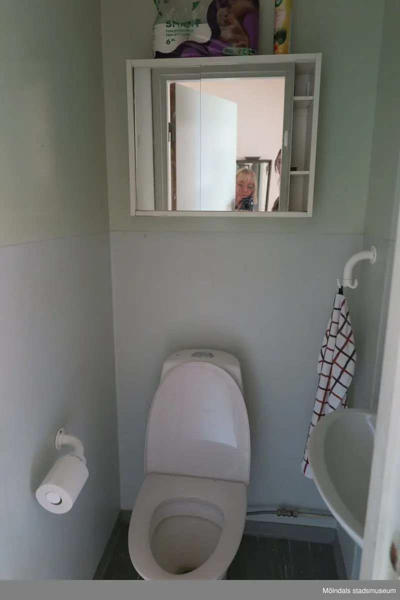 Ett mindre toalettutrymme med vita väggar och vit inredning, Krokslättsgatan 18 i Mölndal 2023-06-21. Från vänster ses en väggfast toalettrullehållare, i mitten en toalettstol, och till höger en handdukshängare samt ett mindre avsmalnat handfat. Ovanför toalettstolen sitter ett vitt spegelskåp på väggen. I spegeln skymtas fotografen. Fotodokumentation av ett friliggande bostadshus/villa byggt 1932 med fyra (4) våningsplan. Byggnaden har tvättstuga i källaren samt torkvind på övervåningen. Boarea: 140 kvm, totalarea: 1004 kvm. Villan är ombyggd och fördelad på fyra (4) hyreslägenheter.