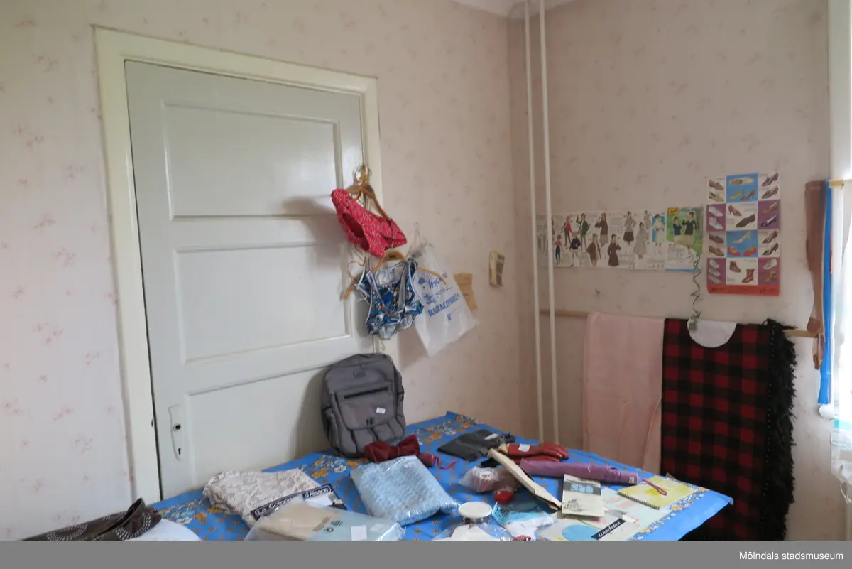 Vänster hörna av ett tapetserat rum med en stängd ljusgrå innerdörr, Krokslättsgatan 18 i Mölndal 2023-06-21. På dörren samt framför den, står ett bord med diverse saker till försäljning. På väggen till höger sitter A4-bilder av tecknade kvinnor samt en skoaffisch. Nedanför hänger två plagg på en trästång. Fotodokumentation av ett friliggande bostadshus/villa byggt 1932 med fyra (4) våningsplan. Byggnaden har tvättstuga i källaren samt torkvind på övervåningen. Boarea: 140 kvm, totalarea: 1004 kvm. Villan är ombyggd och fördelad på fyra (4) hyreslägenheter.
