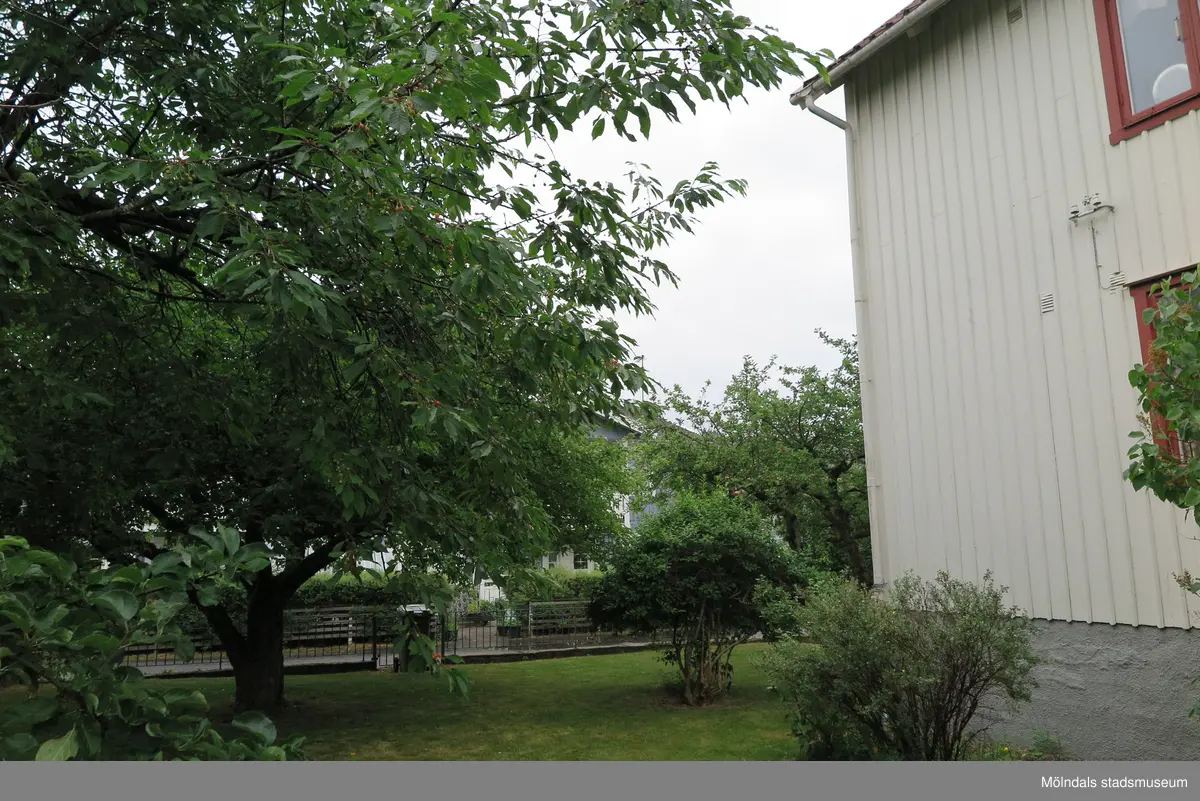 Närbild, fotad från höger, av bostadshusets vitmålade träfasad, två våningsplan med var sitt fönster med roströda karmar, ventiler och två porslins-isolatorer till el-/telekabel (se 2024_1532), Krokslättsgatan 18 i Mölndal 2023-06-21. Nedanför porslins-isolatorerna sitter/hänger en avklippt kabel. Till höger ses en del av trädgården med buskar och ett fruktträd. Fotodokumentation av ett friliggande bostadshus/villa byggt 1932 med fyra (4) våningsplan. Byggnaden har tvättstuga i källaren samt torkvind på övervåningen. Boarea: 140 kvm, totalarea: 1004 kvm. Villan är ombyggd och fördelad på fyra (4) hyreslägenheter.