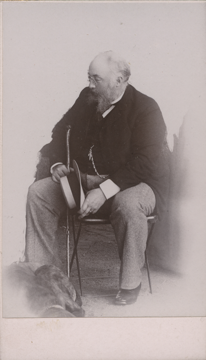 Titel: Mansporträtt av bruksägare Gustaf Benedicks med en hund vid sina fötter.