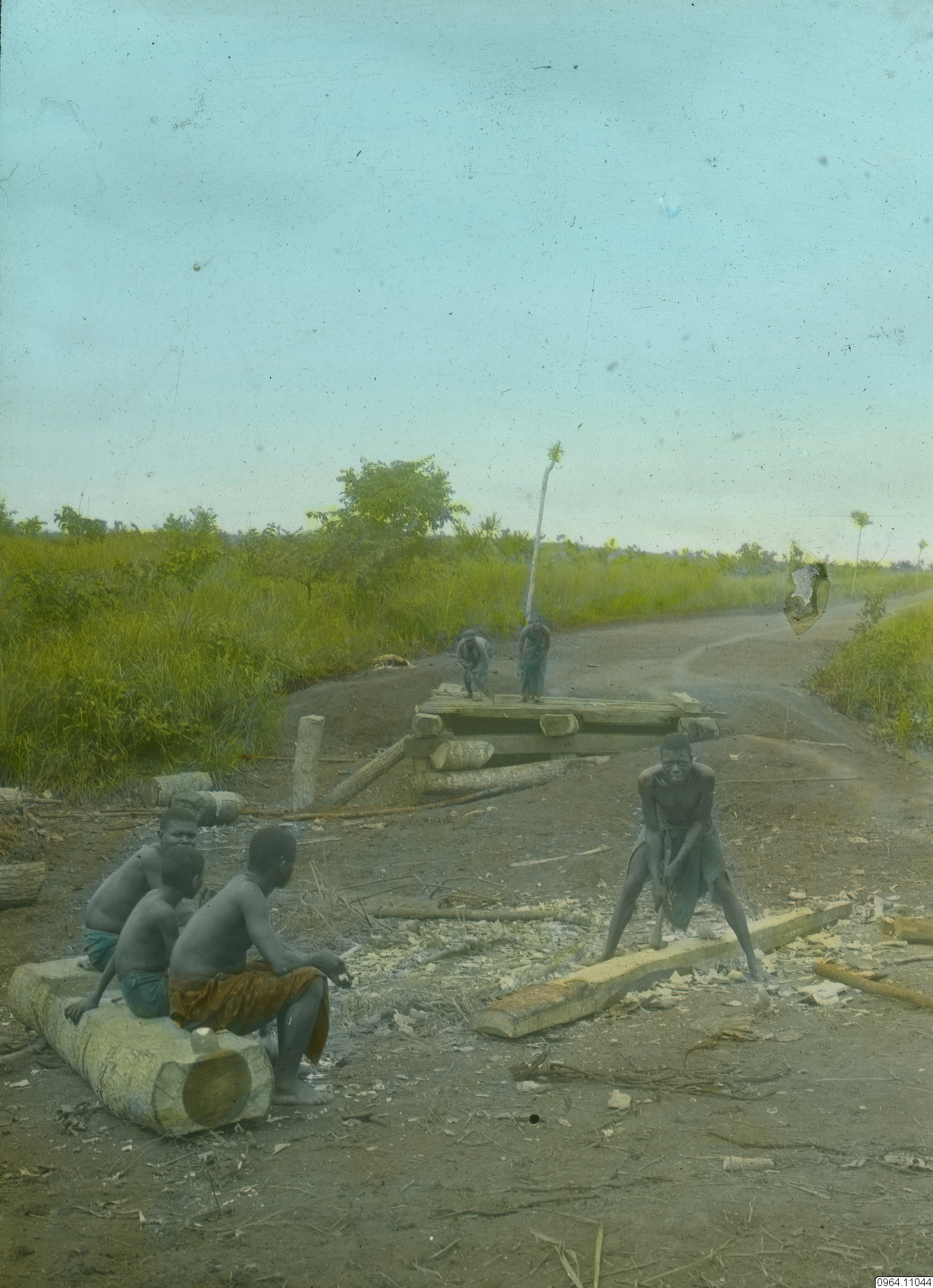 En man som hugger med yxa. Brädtillverkning. Ytterligare två män i bakgrunden. Tre personer sitter och tittar på.