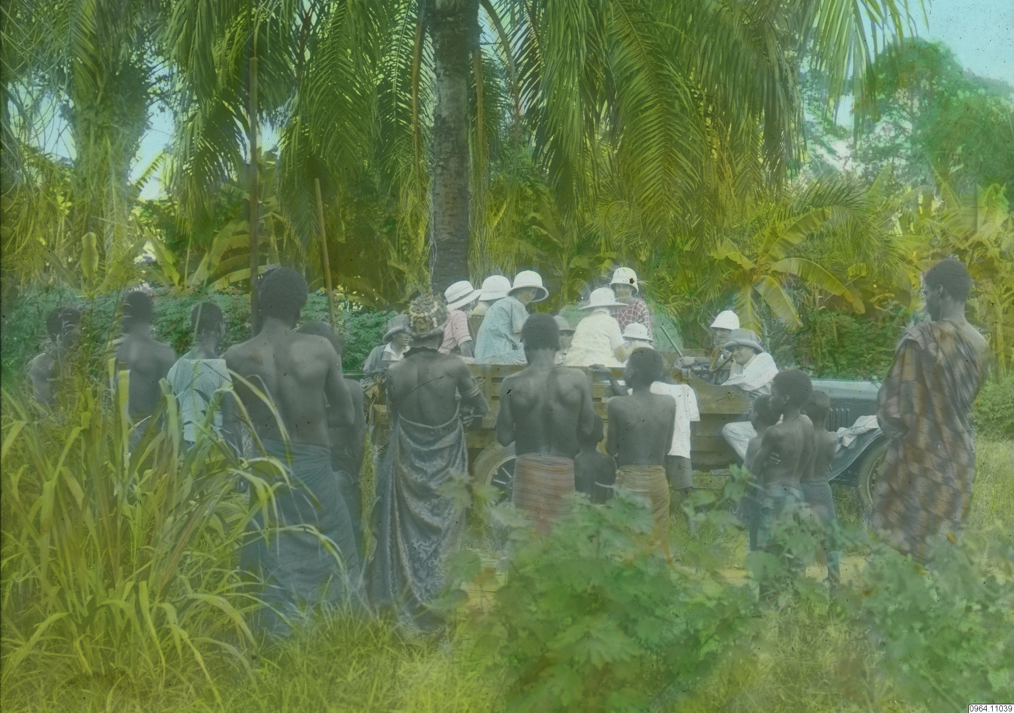 Missionärer som sitter på flaket till en lastbil eller bil. Kongolesiska män står runt om med ryggen mot kameran.