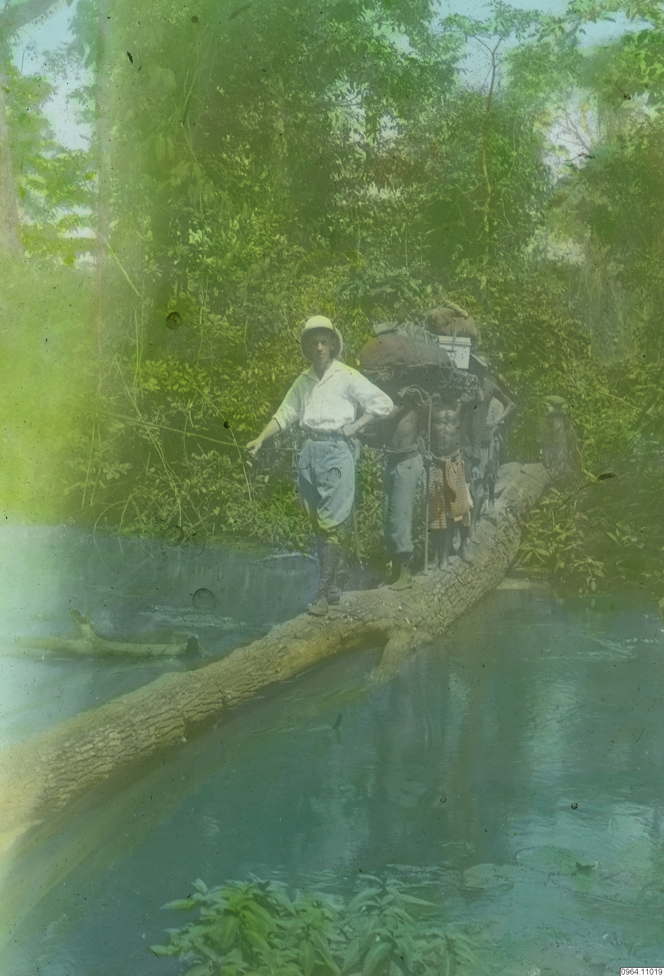 Josef Öhrneman med följe av bärare på stock över en flod.
