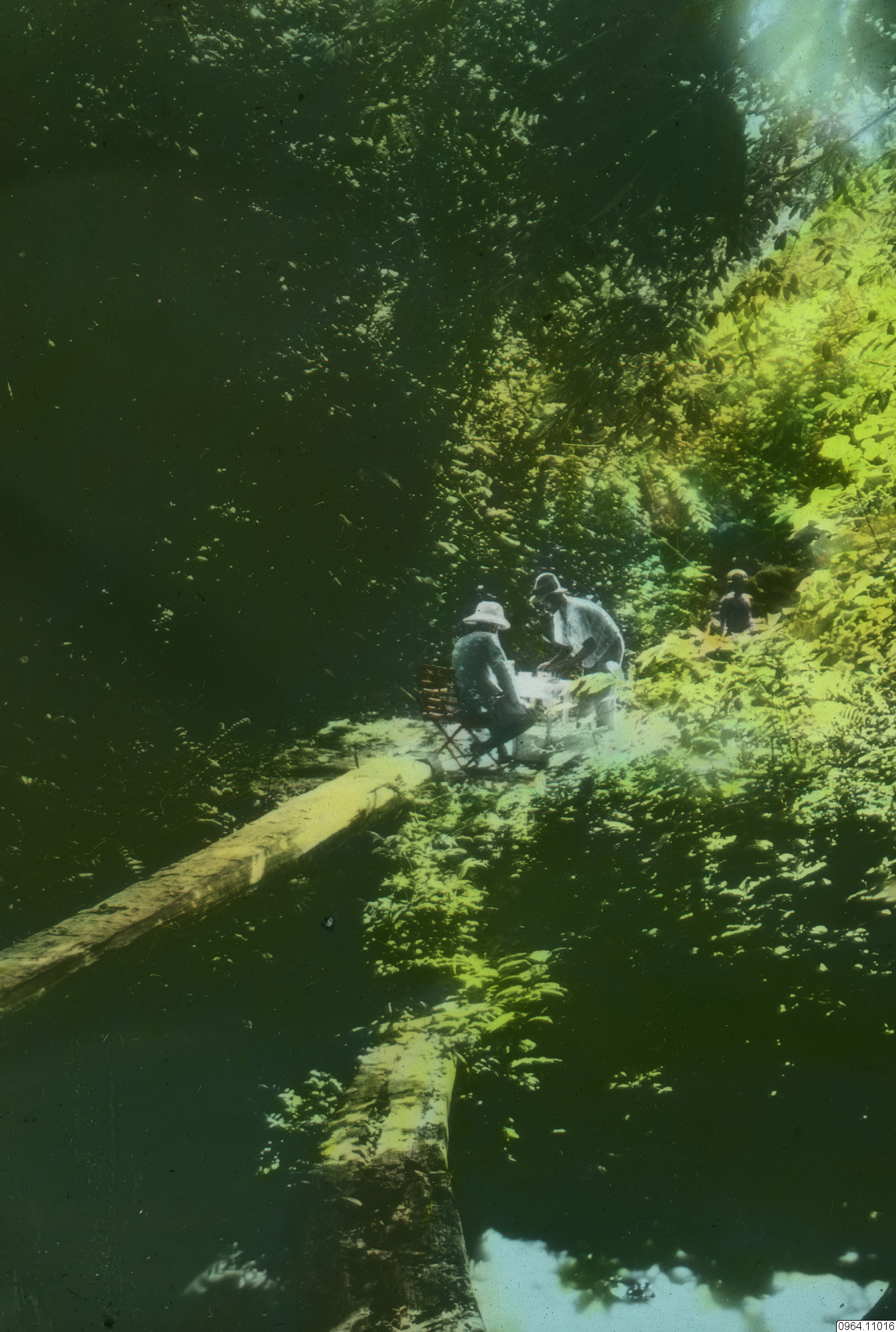 Missionärer vid dukat bord ute i grönskan (odling eller trädgård). Möjligen en bro över vatten i förgrunden.