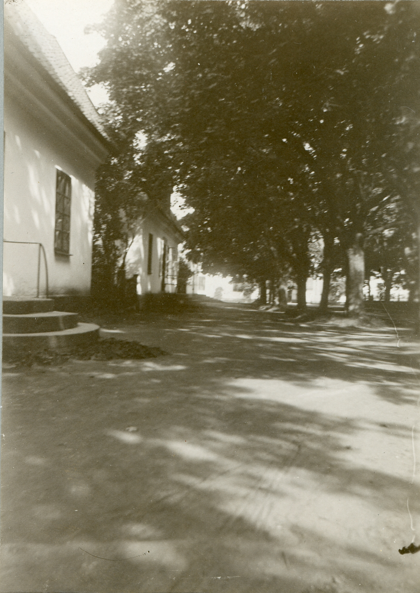 En bruksbostad till vänster i bild med träd som skuggar huset, troligen i Gysinge bruk.