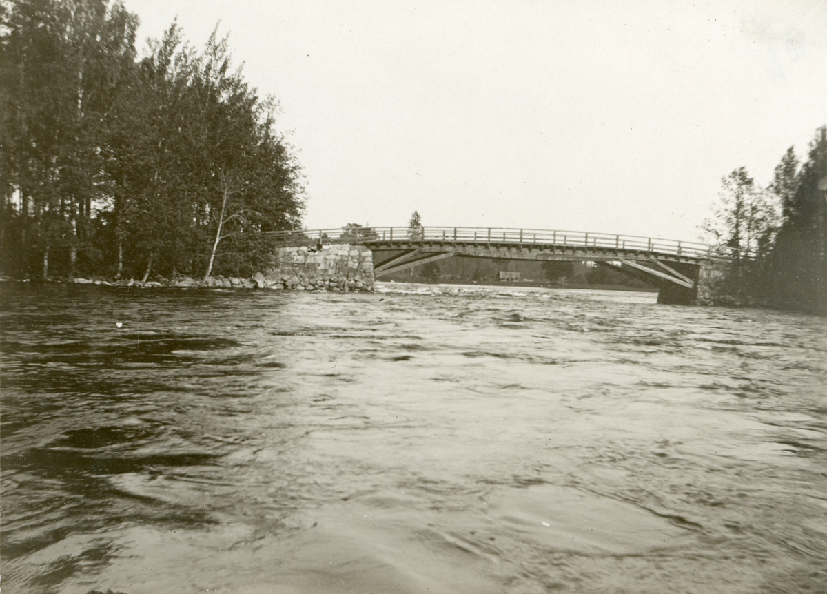 Dalälven med träbro i bakgrunden och växtlighet runt omkring, troligen i Gysinge.