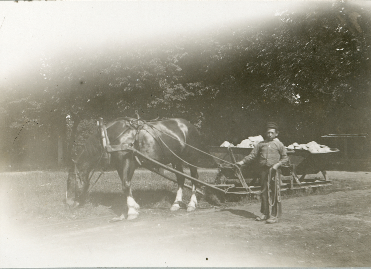 Häst och kärra med troligen sten, samt en pojke vid tömmarna vid Gysinge bruk.