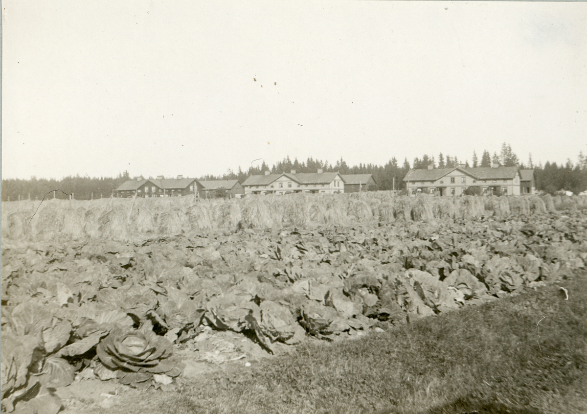 Fotot visar odlingar av sallad mm. samt bostäder i bakgrunden.