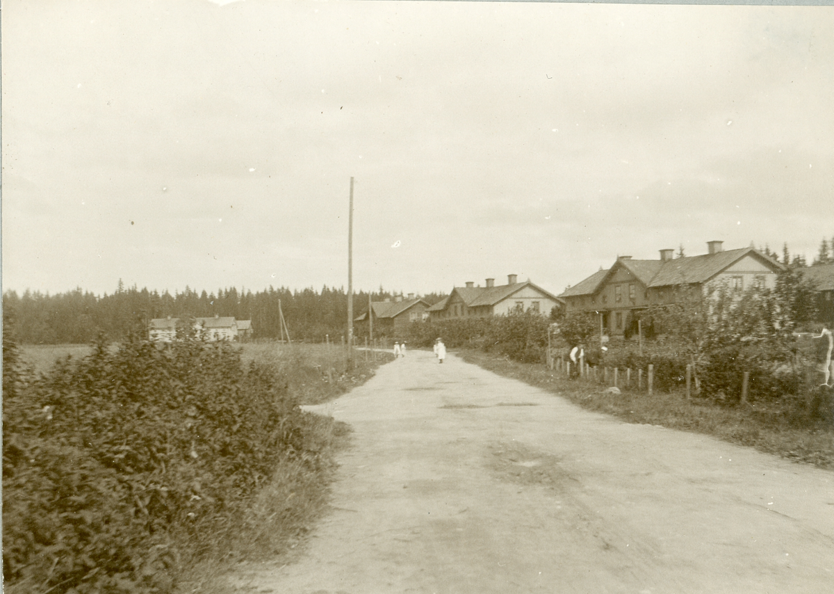 Bruksväg, troligen från Gysinge, med byggnader längs vägen.