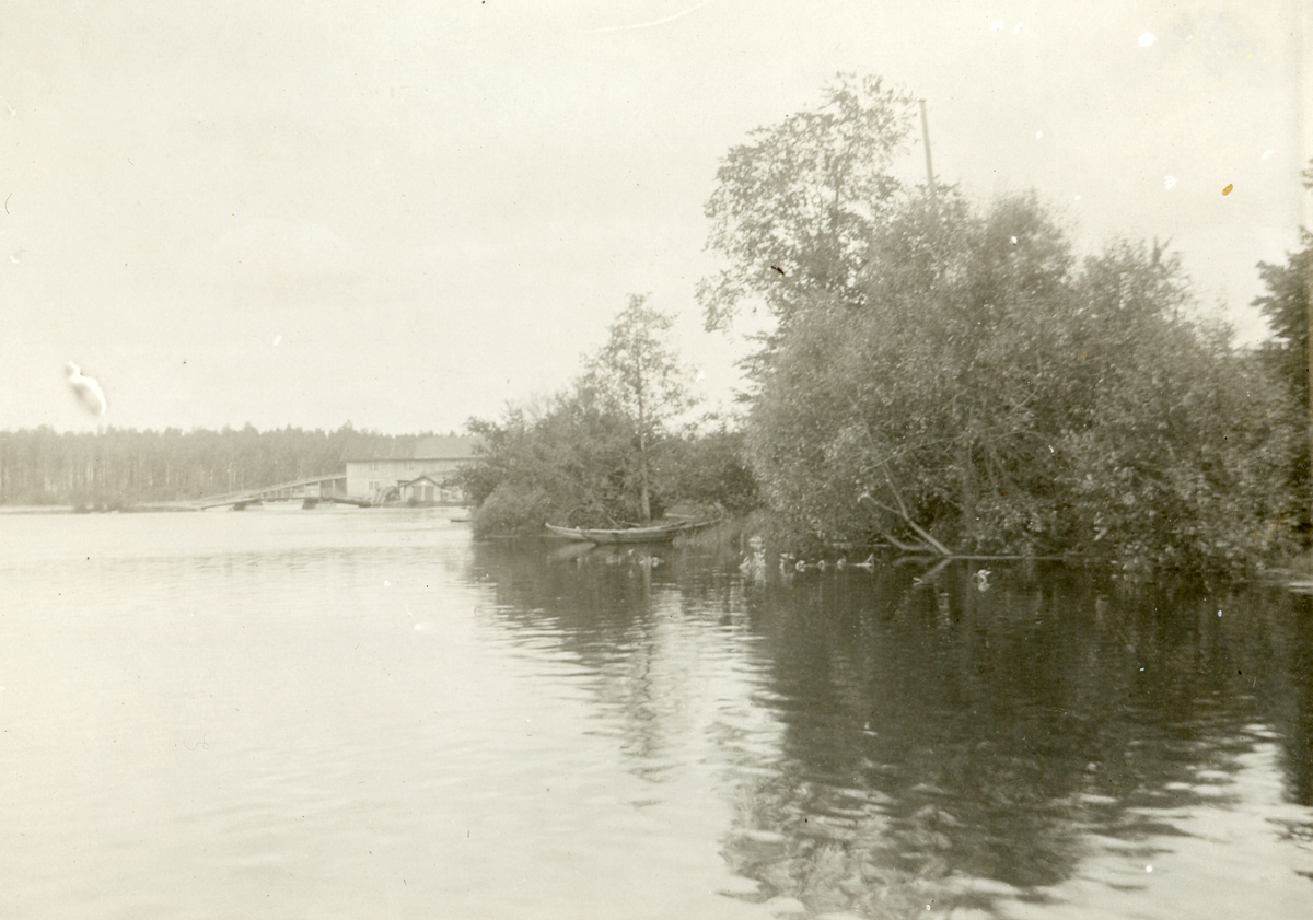 Fotot visar vatten (troligen del av Dalälven) med liten eka uppdragen mellan träd och buskar samt sannolikt en flottningsbyggnad i bakgrunden.