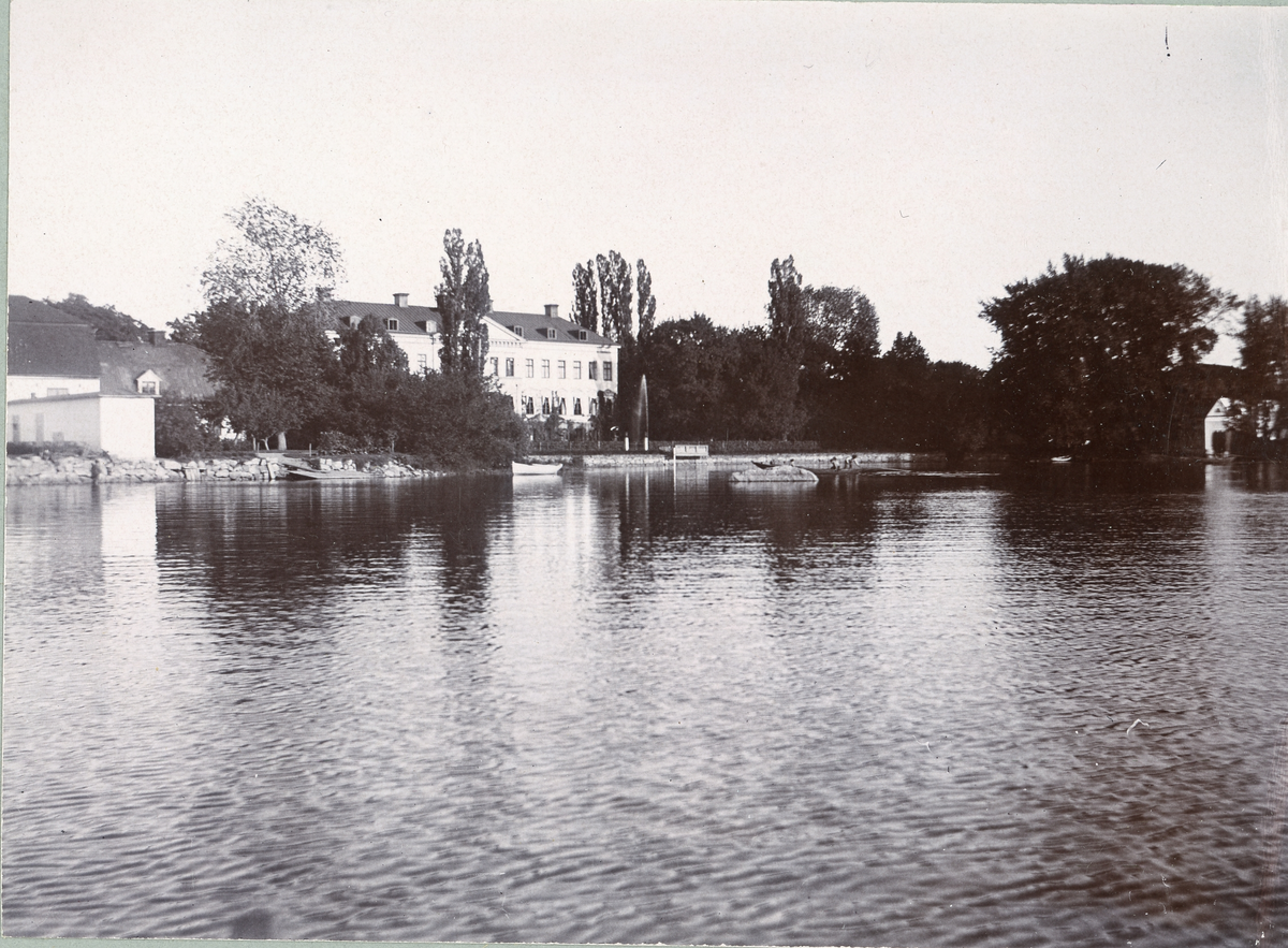 Bild med dalälven i förgrunden och Gysinge Herrgård som syns mellan träden.