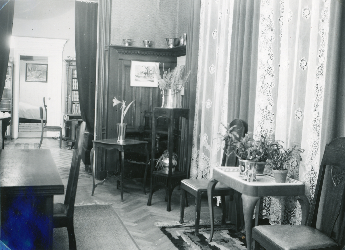 Rumsinteriör med bord, stolar, piedestal, två små bord i rokokostil, gardiner i spets och i ett intillliggande rum i bakgrunden ser man bokhyllor mm. troligen från Centralpalatset i Gävle stad.