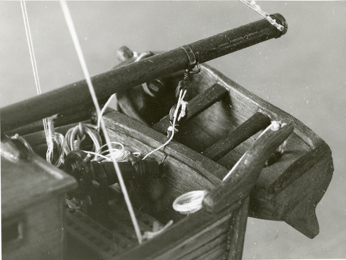 Titel: Fotot visar en liten del av ett modellfartyg, en livbåt som man ser i aktern mm.