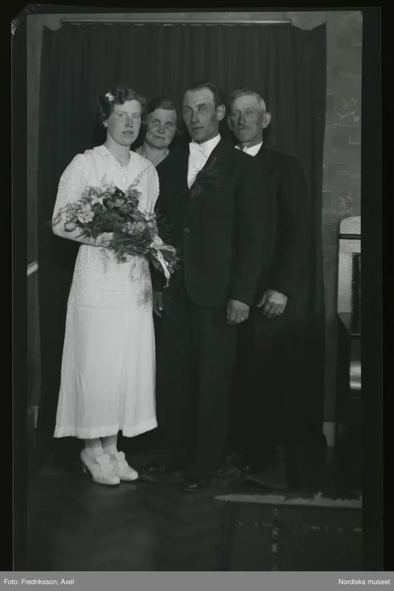 Porträtt av ett brudpar. Bakom dem står en man och en kvinna som kan vara brudgummens föräldrar.